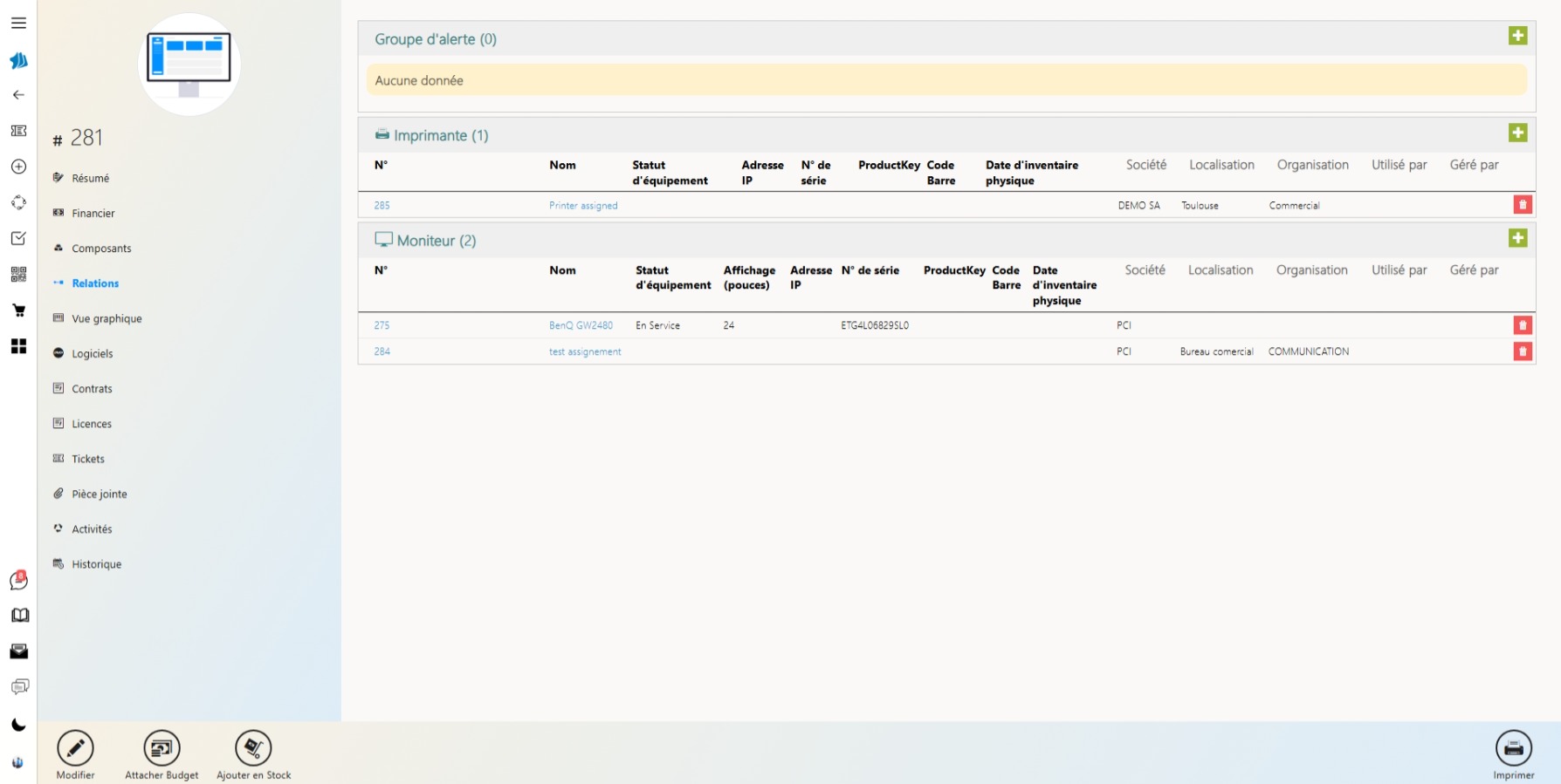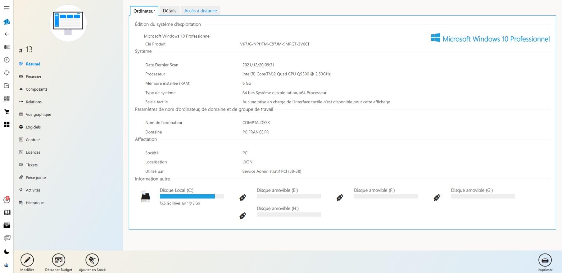 • Tous les composants (carte réseau, carte son, clavier, etc) sont remontés par le scan dans les fiches équipements. On retrouve également les relations de l’équipement (moniteur, imprimantes…)