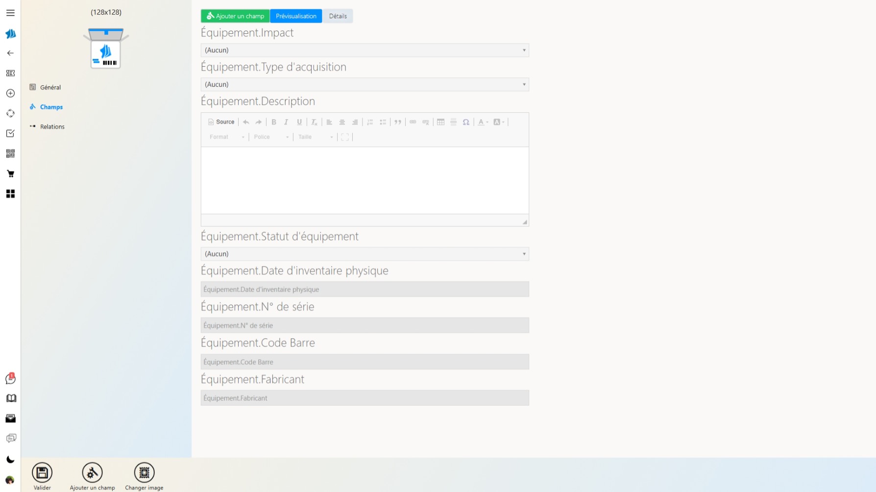 • Chaque type d’équipement peut avoir ses propres champs. Vous ne gérez pas une imprimante comme un poste utilisateur. Vous choissiez le type de champ (liste, case à cocher…)