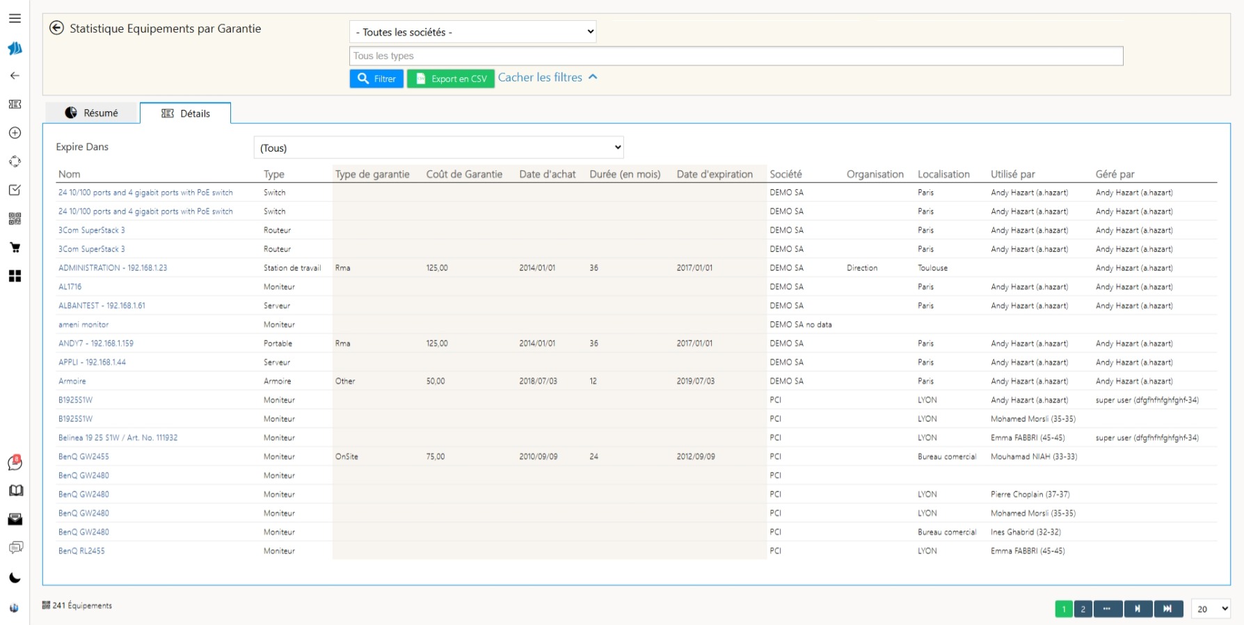 • Durée, coût, type de garantie, date d’expiration… La vue financière et les filtres avancés vous permettent de suivre toutes les garanties actives/expirées ainsi que les équipements sans garantie.
