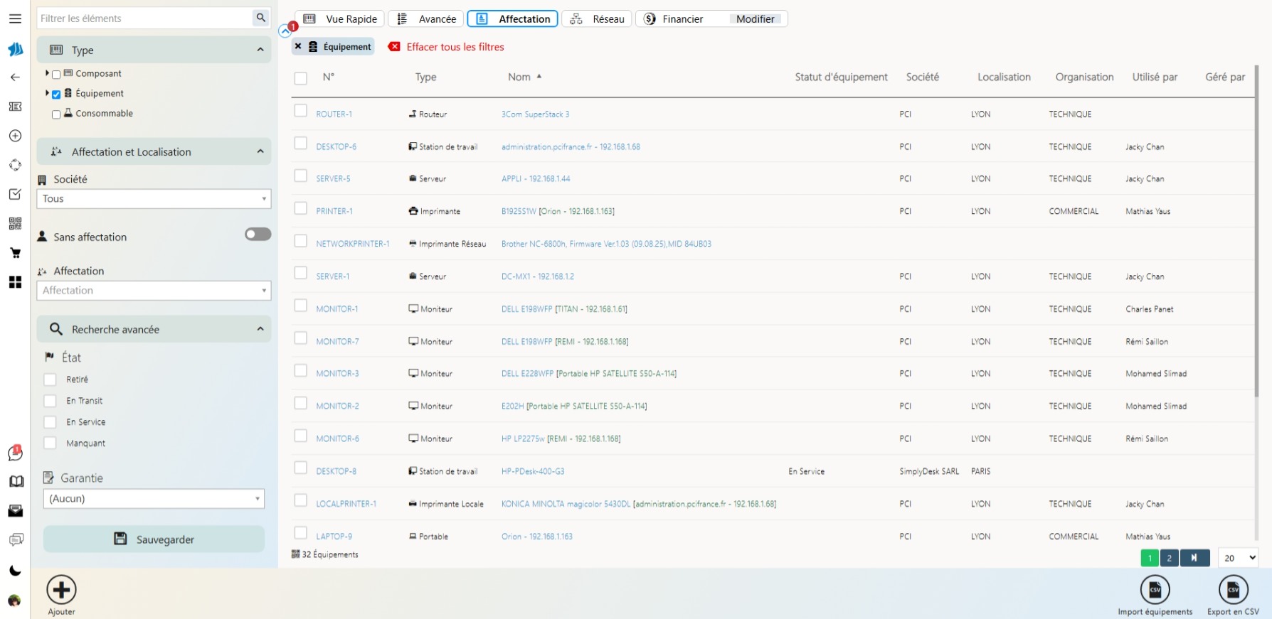 • Vue affectation : qui utilise quoi, où et sous quelle société, quelle localisation
