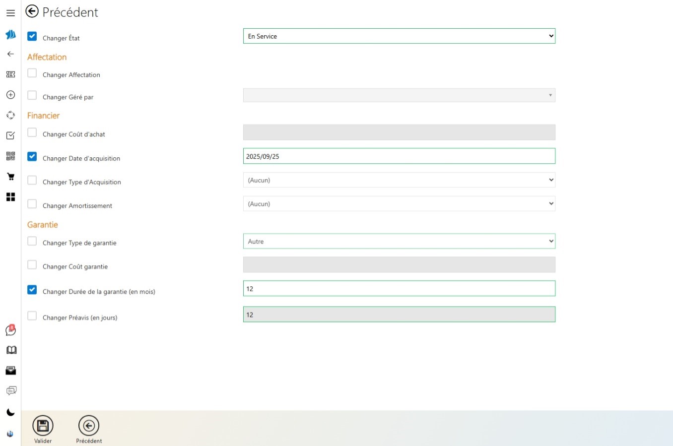 Vous avez la possibilité de modifier des informations de plusieurs équipements en même temps au lieu de faire un par un (affectation, garantie, amortissement…)
