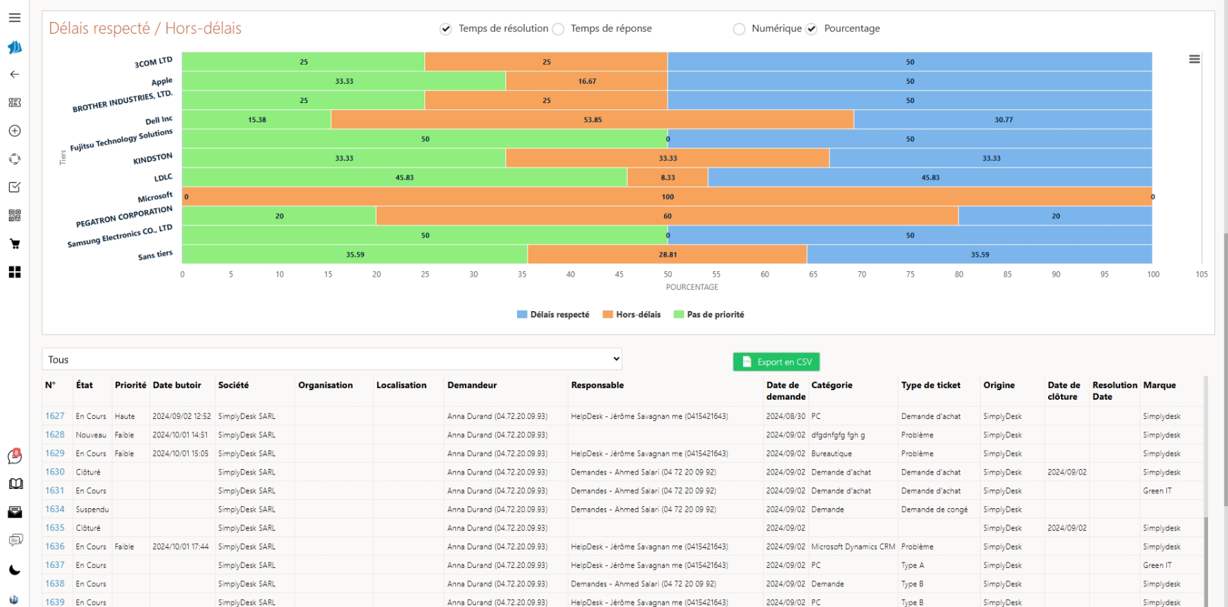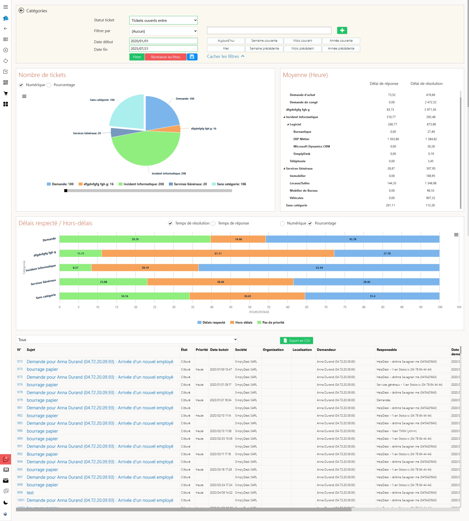 Avec SimplyDesk, vous pouvez croiser différentes données issues du Helpdesk, du parc informatique ou du parc mobilier. Cela vous permet de repérer plus facilement les vrais problèmes : un équipement qui tombe souvent en panne dans un service, un site où les demandes sont plus urgentes, ou encore des tickets qui prennent trop de temps à être résolus. Ces statistiques croisées offrent une vue d’ensemble plus précise et aident les gestionnaires à mieux organiser le travail, à faire les bons choix d’investissement, et à améliorer la qualité du service rendu aux utilisateurs.