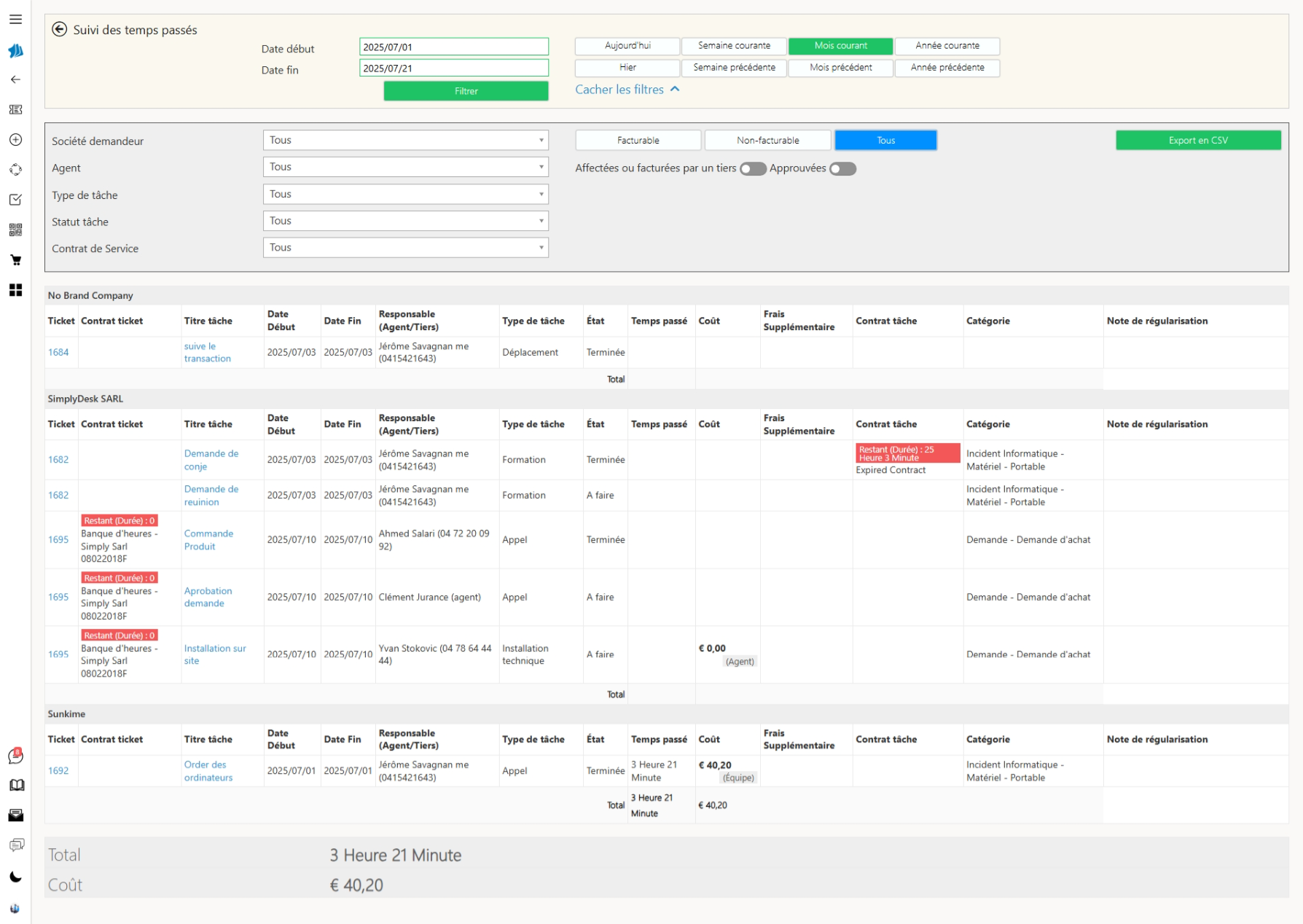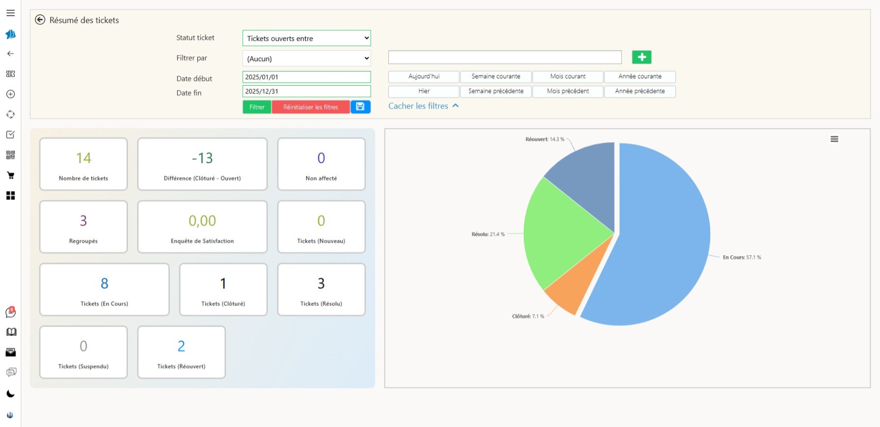 • Historique des actions par ticket, pour une traçabilité complète Une visualisation par agent ou par groupe permet de mieux répartir la charge et d’adapter les priorités en fonction des urgences ou des retards accumulés.
